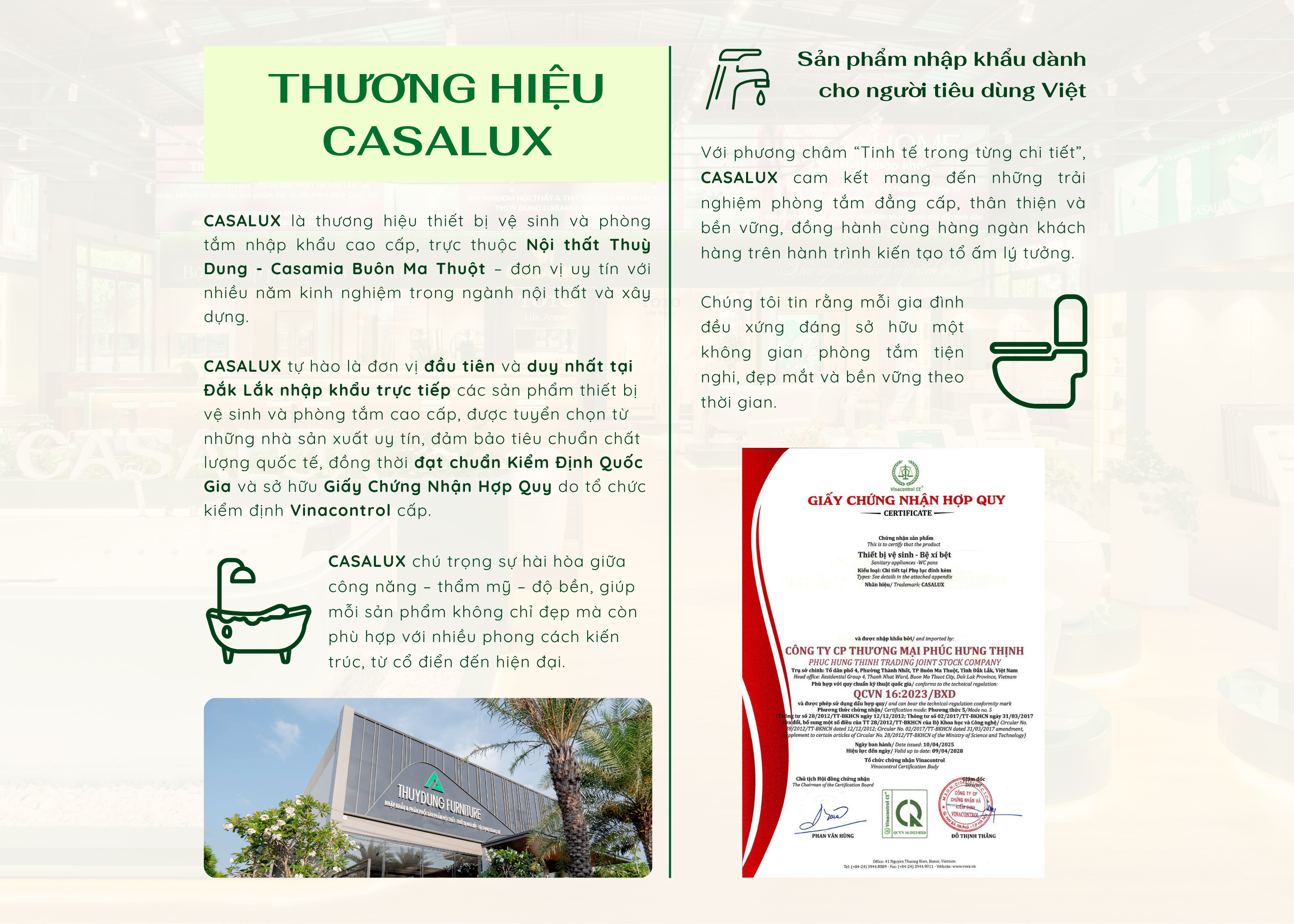 Các sản phẩm Casalux được nhập khẩu trực tiếp từ các nhà máy đạt tiêu chuẩn quốc tế và có chứng nhận hợp quy VINACONTROL.